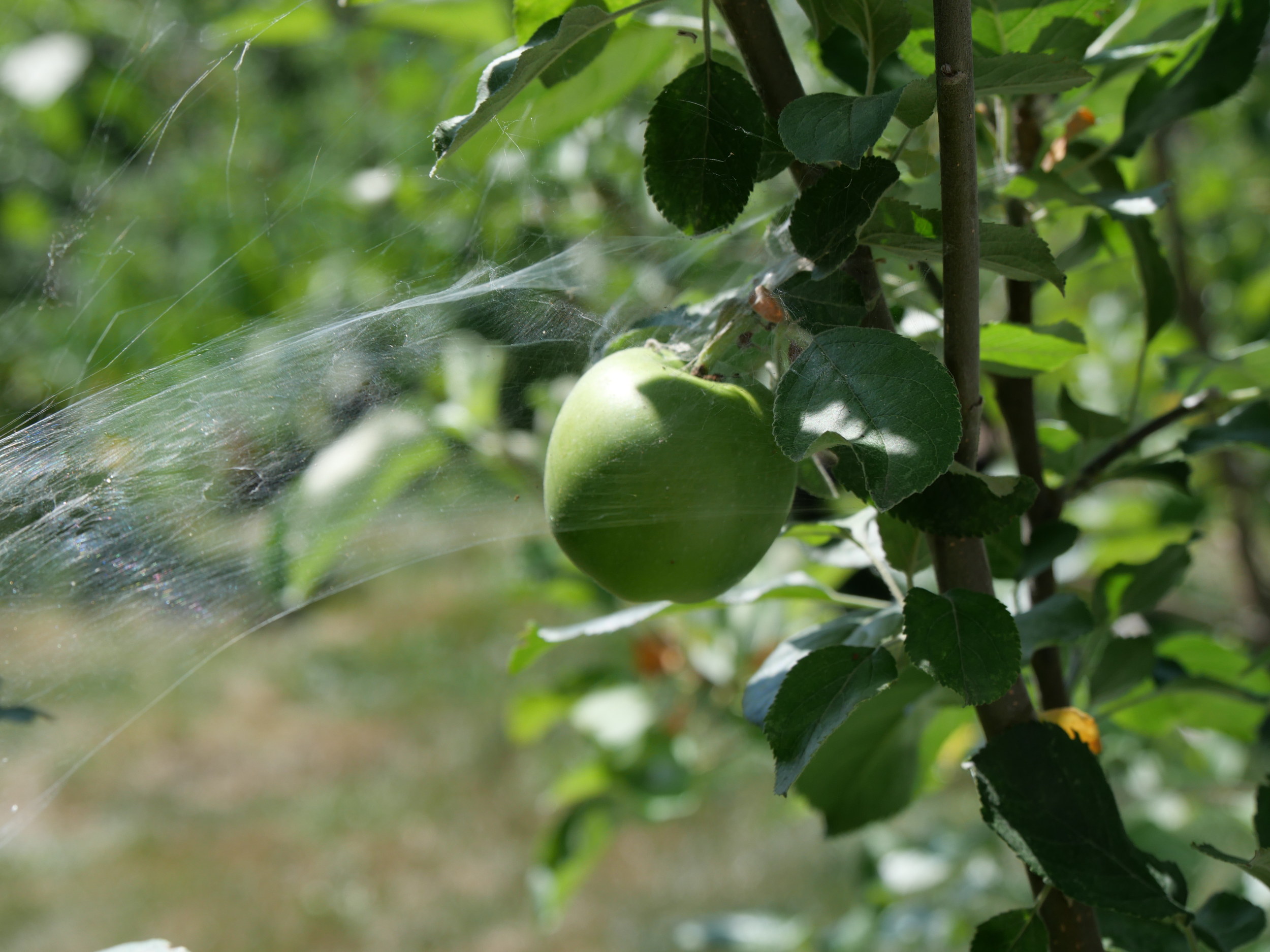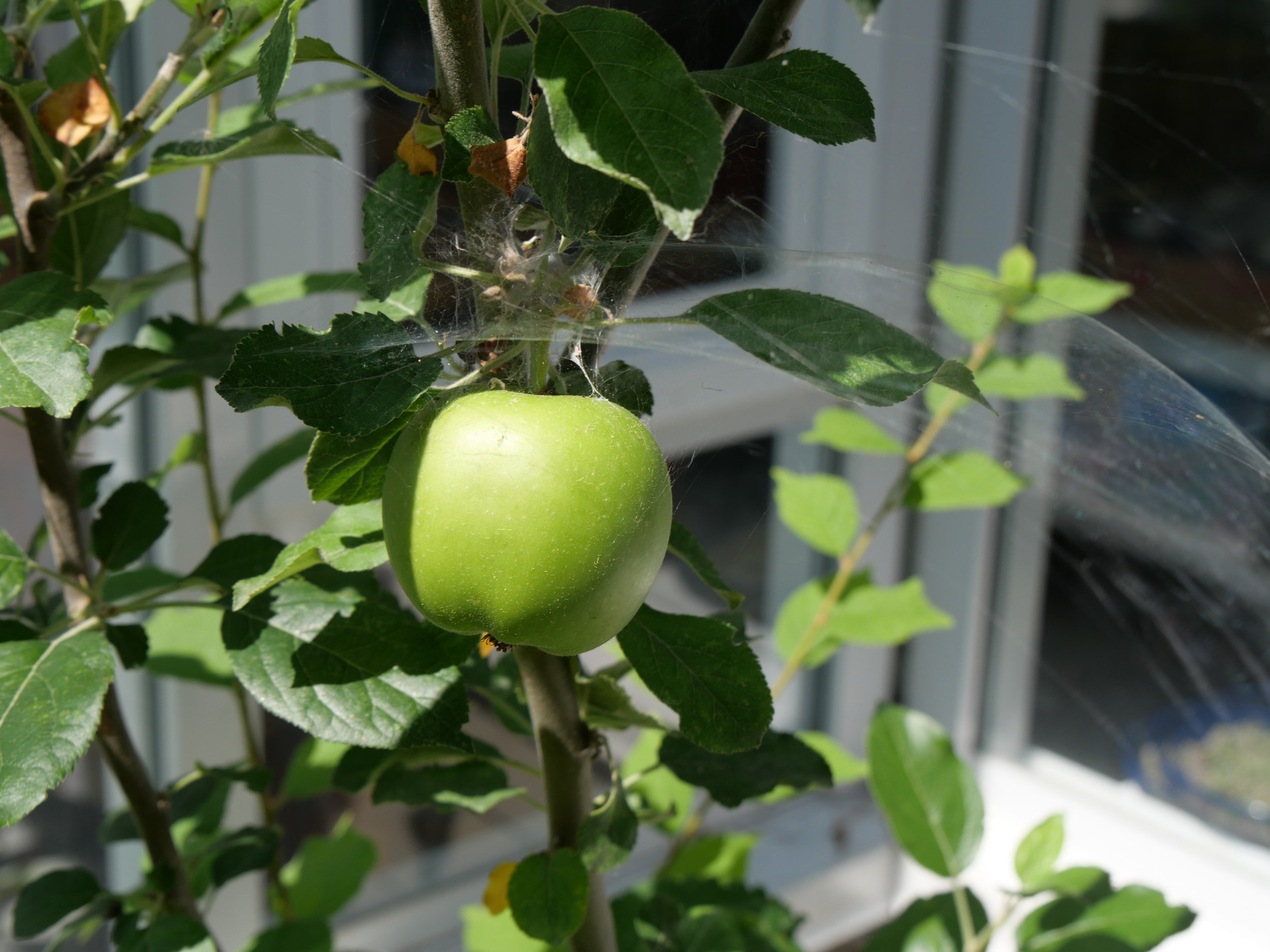 Apparently she knows about codling moths coming to apples to lay their eggs, and she’s placed the apple under a big protective tent.