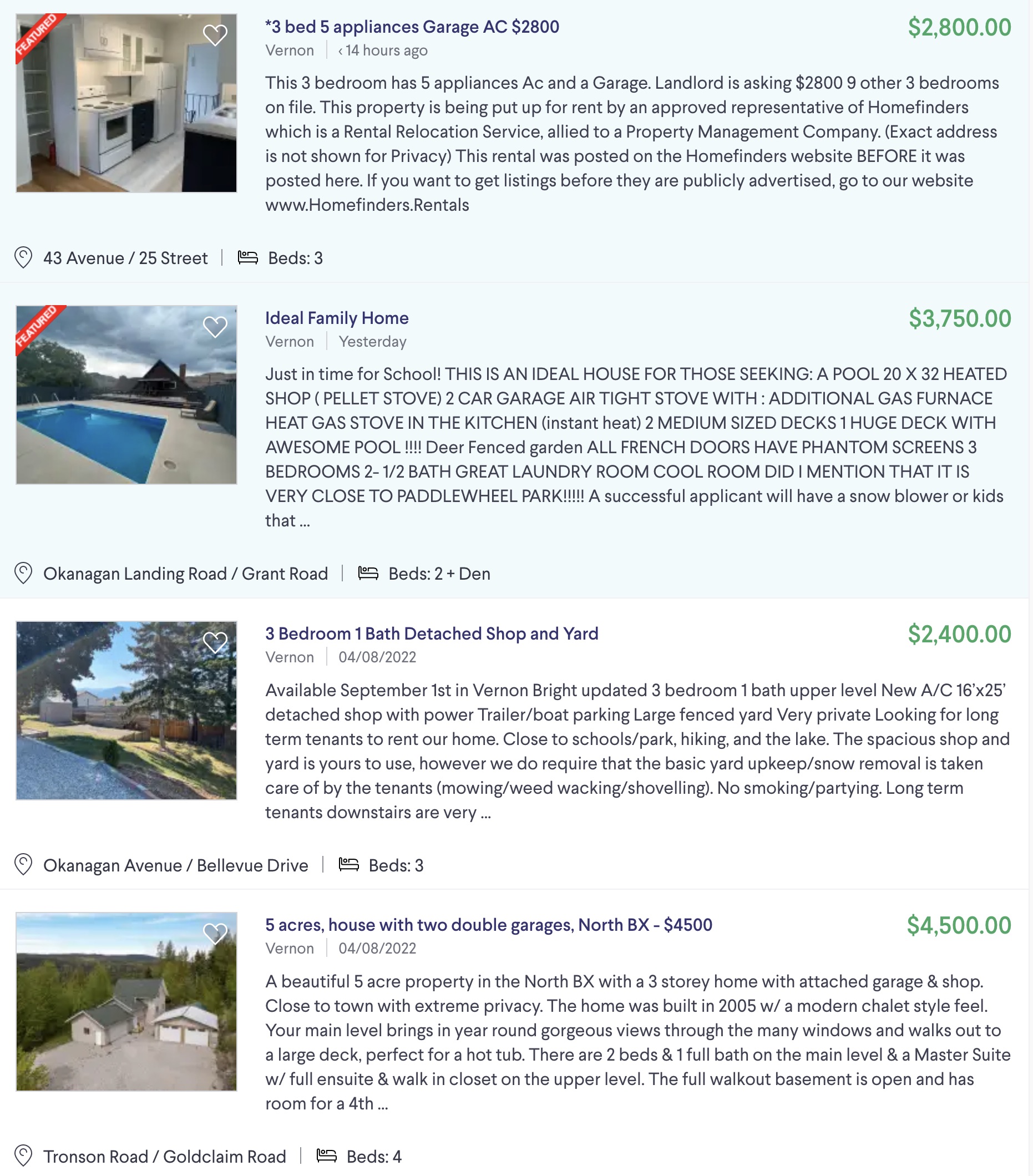 It costs $2400-$4500 to rent a house in the North Okanagan. Really. Look.