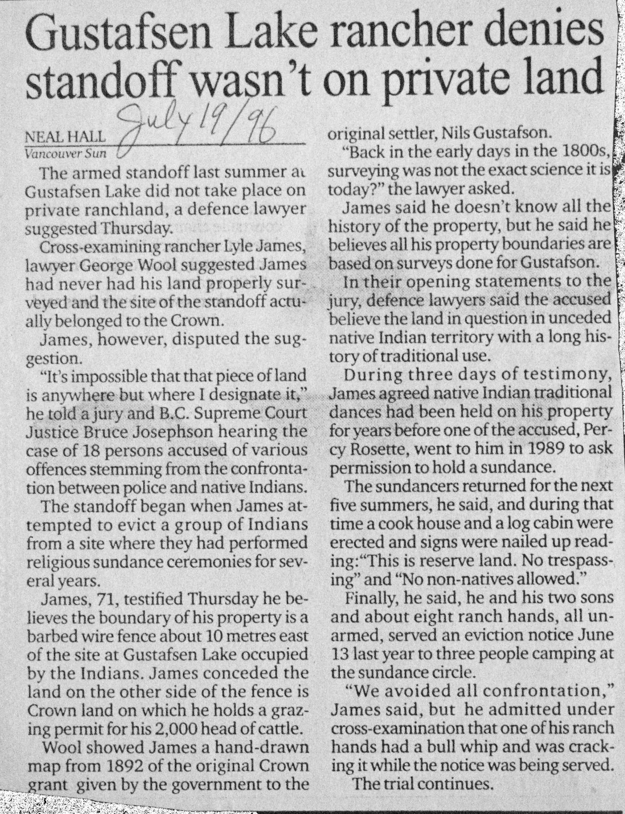 This confusion of jurisdictions in the absence of any historical treaties is simple enough. The tricky thing, though, is that the creek had been dammed, and had spread far past its banks, forming a beautiful blue water body rippling among water lilies and rimmed by aspen trees. Tree swallows, glistening, green and black, darted in and out of nests in their trunks. Leaves danced. Now it was a lake, not a creek, with shores that passed onto James’ land. Those shores were not the ones that British Columbian law assigned to the Secwepemc. They still had their “creek”, just lower down. That’s the story as an Indigenous friend told it to me years later. For his part, James claimed that the sundance site was 10 metres inside his fence.