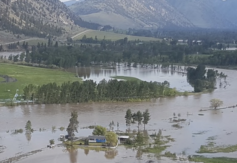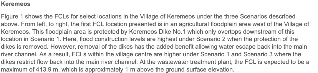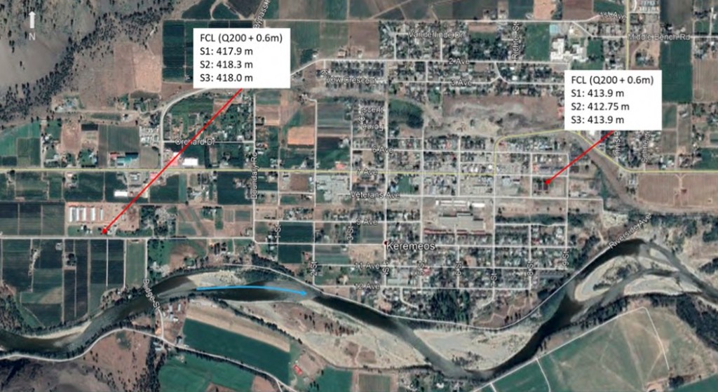 There could easily be more. Here are a few scenarios prepared by Ecora Engineeering in March 2021. This is the town of Keremeos. A metre of water over the entire town, as the caption for the image shows, is not beyond imagining. Keremeos is actually in the lake that people call a river. Nice.