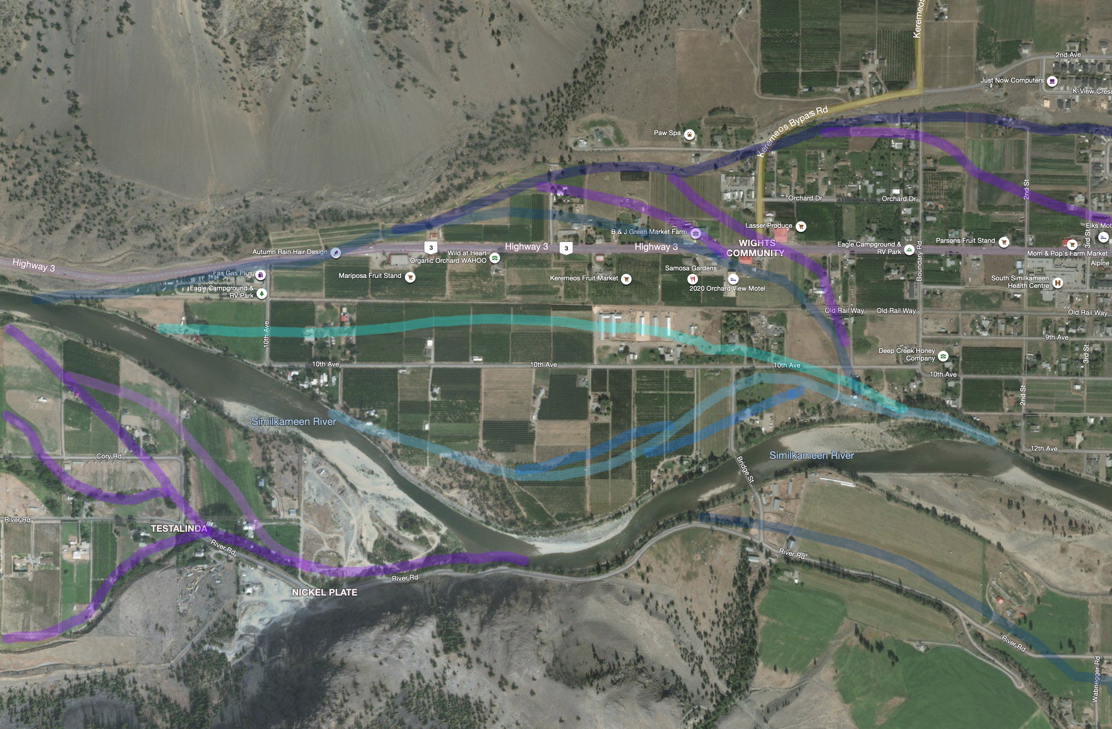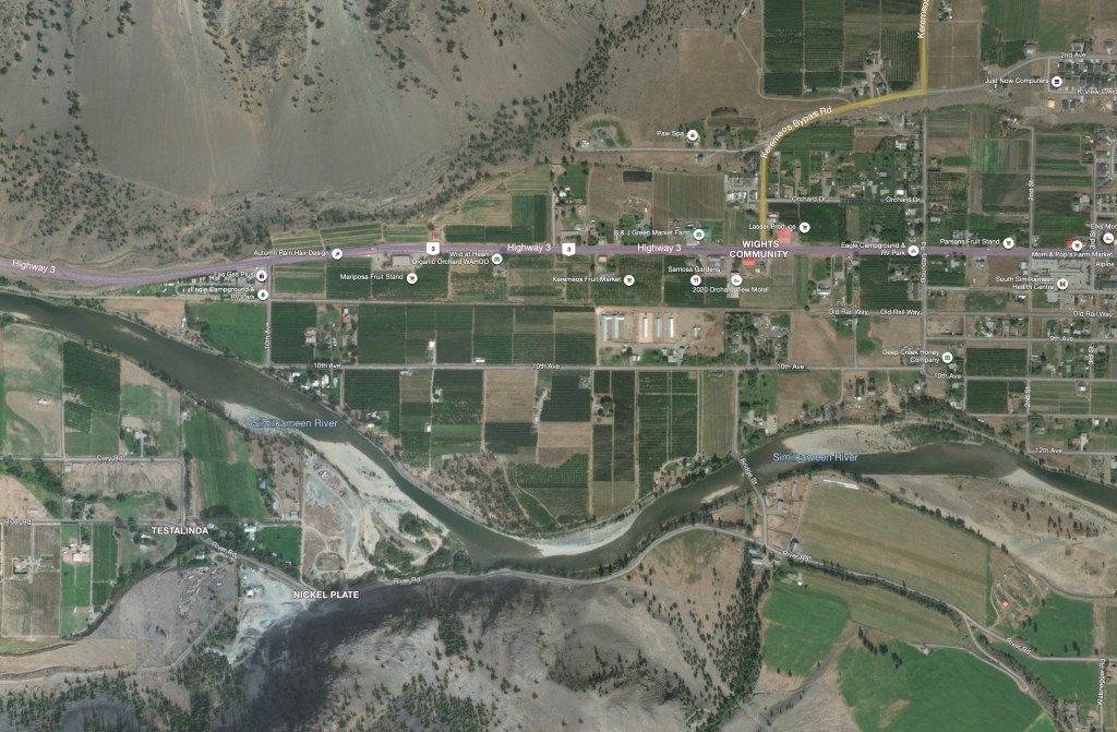 All of the town of Keremeos, orchards, vegetable farms, hayfields and houses, fills the wedge created by this bend. If the top of the dike were to go, the river would take the town (effectively an old sandbar between old flood channels) away completely and deposit it somewhere down on the reserve in Chopaka, downriver.