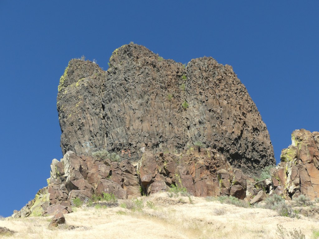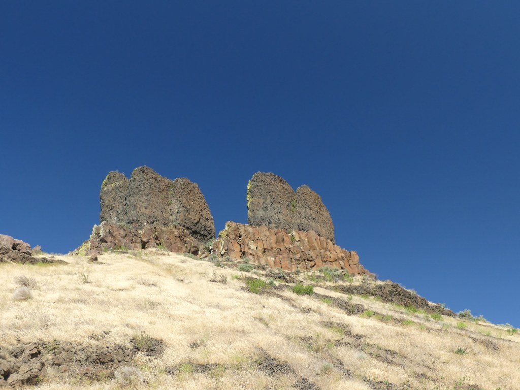 It’s not my place to tell this story, and I’d do so poorly, but I think a few observations are warranted. First, these are distinctive landforms from the river. Second, the story is not “long ago”. This is the story ongoing. Third, to Western eyes, and perhaps Cayuse ones, these figures don’t look like two young women or a wild dog. It’s an important point. By naming them so, all the other characteristics one can make out (or imagine) in the rocks is part of those characters and their story. In other words, looking at the southern sister…