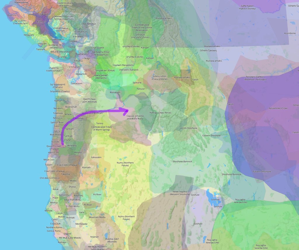 Note how territories overlap due to kinship ties, often created by alliance-slavery. War would have created hard boundaries. Nez Percé (Nimiipuu) and Cayuse territory are marked in white.