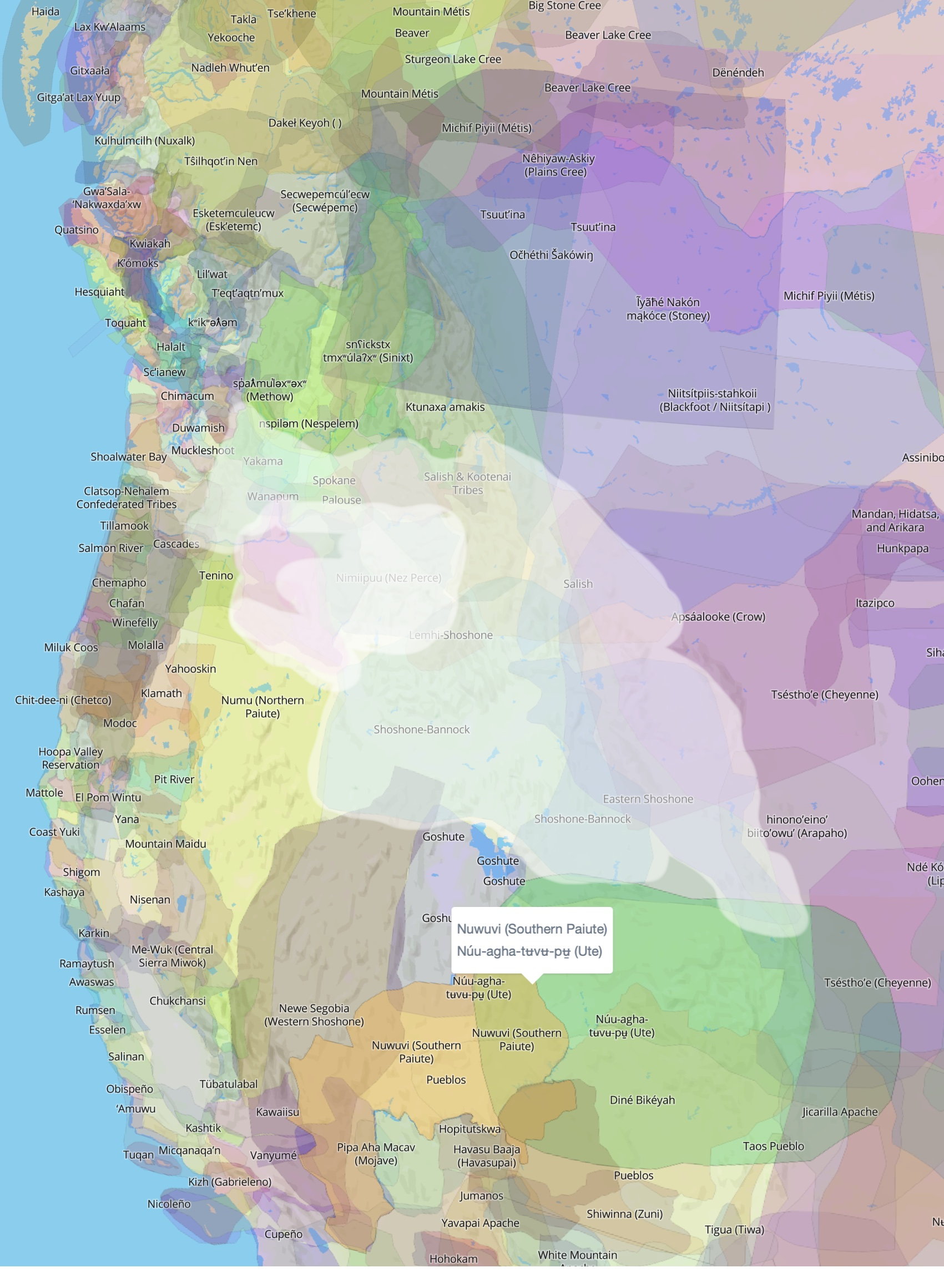 But that’s not the whole story. Kinship ties (marked in white below) put the territories very close, only separated by the Utes.
