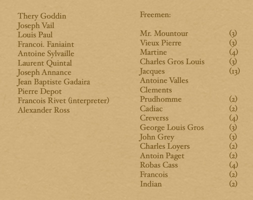 Add 11 French Canadian Indentured Servants and that’s 54 men (and their wives and perhaps children), only one of which is not French: Alexander Ross. The John Grey mentioned was a Scots-Iroquois.