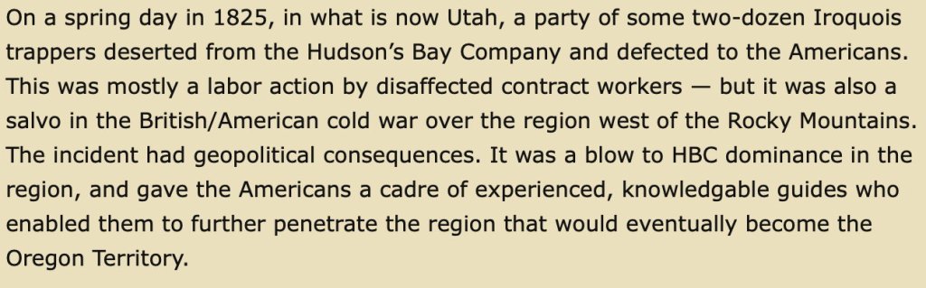 Ignace Hatchiorauquasha, aka John Grey, son of a Scottish soldier of the American Revolution and a mohawk woman. He was born in 1795 and became a trapper and grizzly bear killer. He was raised at the Kahnawake Mission in Montreal, but his allegiances weren’t precisely English, a troubling fact which hadn’t escaped Ross’s notice. I’m guessing that he is one of the 5 Iroquois boatmen named Ignace (After St. Ignatius, a name conferred at Kahnawake) who abandoned David Thompson’s expedition in the Bitterroot Valley in 1809. I will keep digging around into that and let you know what I find.