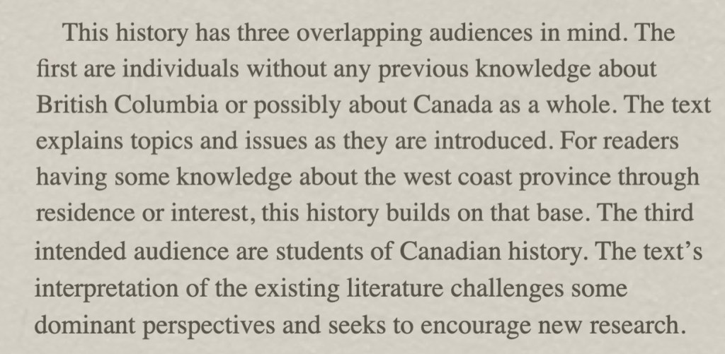 Simply, the history of this place, it’s “natural history”, including its “human history” and including you, should you be there, is not the topic of any book of history of this place. What that means is that this history might not have been written for you, even though you live in the space claimed by British Columbia and have an independent relationship to it. Instead, it’s a primer on a political state, very useful to newcomers to the political situation. If you’re looking for something that actually rises from this geography, though, then this history might help: