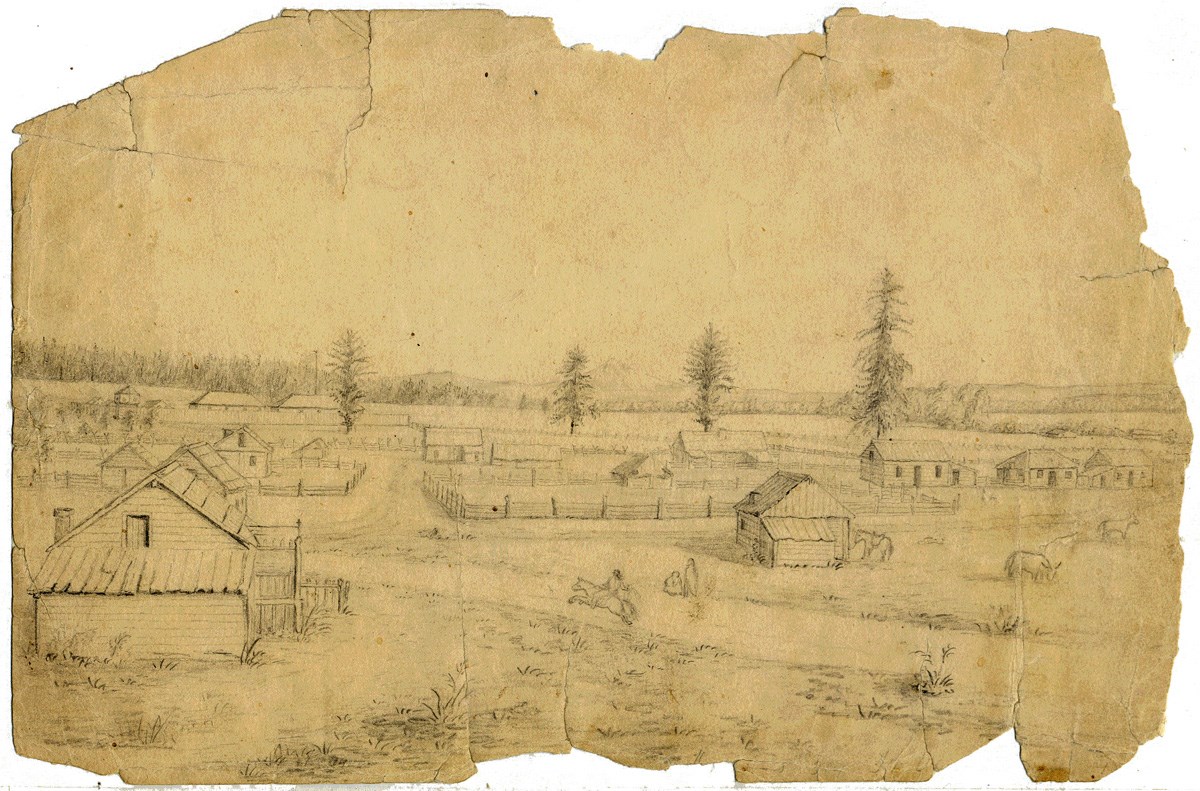 This sketch by A.B. Roberts, now in the Fort Vancouver National Historic Site museum collection, shows the fort’s employee village. In the background, the fort and Mount Hood. USNPS photo. Source.