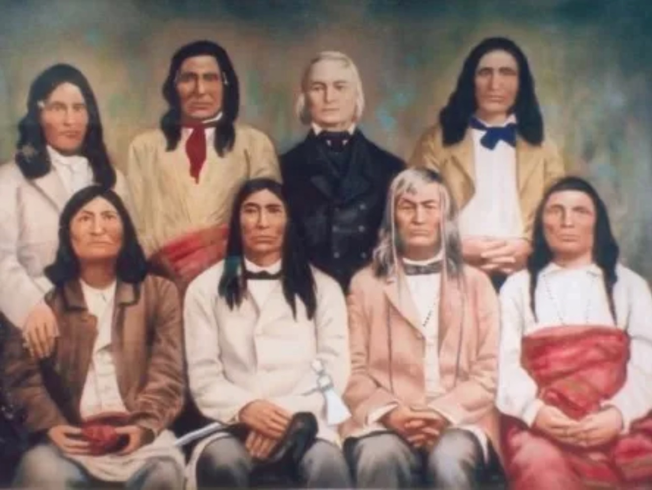 Photo : Le Père Pierre-Jean de Smet au milieu de représentants des tribus Colville, Tête-Plate, Kalispel et Coeur d’Alène (1859). Source.