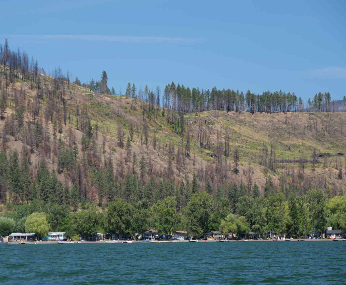 The shore of kɬúsx̌nítkʷ near Head of the Lake. These holiday cabins are on land leased from the Okanagan Indian Band.